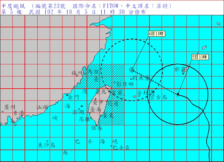 編號第23號的中度颱風菲特(FITOW),中心氣壓960百帕。,在5日11時的中心位置是北緯24.5度,東經127.3度,即在台北的東方約590公里之海面上。