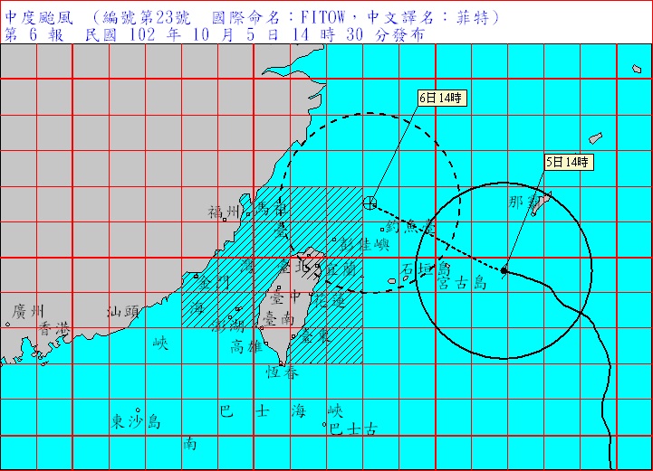 氣象局指出,編號第23號的中度颱風菲特,中心氣壓960百帕。5日14時中心位置在北緯24.6度,東經126.9度,即在台北的東方約550公里之海面上。