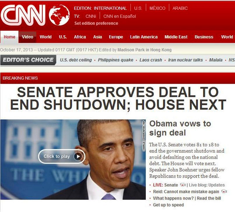 根據美國有線電視新聞網CNN於17日報導,美國參議院以81比18通過法案,結束政府關門並避免美國國債債務不履行的窘境。眾議院議長貝納(John Boehner)則呼籲同黨的共和黨議員支持這項法案。
