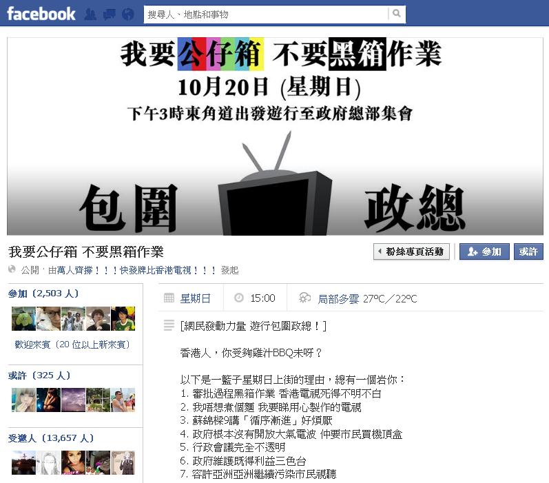 另外,網友前天傍晚在臉書(facebook)上成立《萬人齊撐!!!快發牌比香港電視!!!》粉絲專頁,至截稿為止已超過45萬人按讚,並發起「我要公仔箱,不要黑箱作業」遊行活動,希望民眾可以在週日一起上街遊行,到香港政府總部表達抗議及不滿。