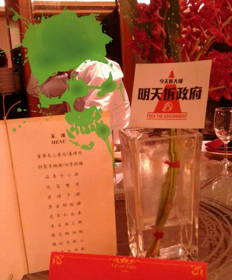 不過,這個畫面也疑似被人用手機拍照後,傳給學者黃國昌。從他po在臉書的照片,看得出拍照當時,疑似就是眾人用餐時間。到底是年輕選手們把「拆政府」貼紙帶入會場,表達抗議,還是抗議人士事先就布置好,不得而知。