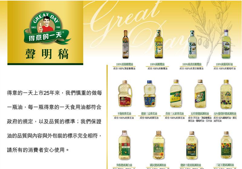大統長基公司生產的食用油發生攙偽與違法添加、標示不實等,而根據黃偉哲今日提供的資料,「得意的一天」葡萄籽健康調合油、多酚健康油等內容物,可能也與標示有出入,引發社會的疑慮。佳格公司今日緊急在官網貼出聲明,堅稱「得意的一天上市25年來,慎重的做每一瓶油,每一瓶食用油都符合政府規定,所有產品內容物皆與標示相符。」