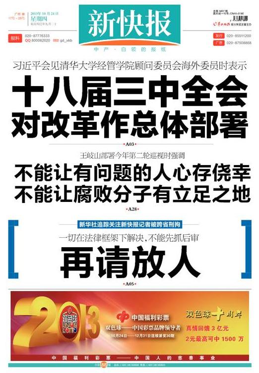 廣東《新快報》繼昨(23)日在頭版刊登了標題為「請放人」的報導,聲援因報導中聯重科的財務問題而遭警方逮捕的該報記者陳永洲後,今(24)日再度於頭版刊登「再請放人」4個大字,並要求警方不能先抓後審。