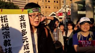 「下一代幸福聯盟」昨天下午號召數萬人,聚在凱道反對修改《民法》讓同性婚姻合法化,不遠處的台大醫院前更設置一道巨大的氣球拱門,標示出會場的範圍,但就在這條界線上,近百位舉著「婚姻平權」標語牌的學生和民眾,也自發性來到此地集結。其中,不但有1對女姓當眾接吻高喊「Love and Peace」,也有同志諮詢熱線協會的講師Winter舉著「支持多元成家,拒絕宗教抹黑」的牌子,不斷對拱門下的「下一代幸福聯盟」秩序糾察們進行演說,釐清婚姻平全訴求的本質、解釋同志的處境,聲援者則圍繞在他身邊。