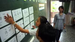 複習過諺語,許老師拿出12張A4大小的字卡,貼在黑板上,每張上面有一個詞彙的漢字、台羅拼音,外加注音符號。搶答遊戲開始,老師出題:「洗衫」!上台的兩位小朋友眼光快速在字卡間搜尋,一人搶先出手,「啪!」地一聲拍在寫著「sé-sann 洗衫」的字卡上,得分!全班的情緒都跟參賽者一樣亢奮。