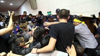 針對占領立法院議場的反黑箱服貿學生與民眾,警方在今(19)日凌晨3點37分展開攻堅行動,部分警力突破面對主席台左手邊的門口路障、人牆進入議場,但在現場民眾高喊「警察後退」,僵持快10分鐘後,民眾手牽手牽成手鍊將警察送出出入口後,3點52分警察暫時撤離。