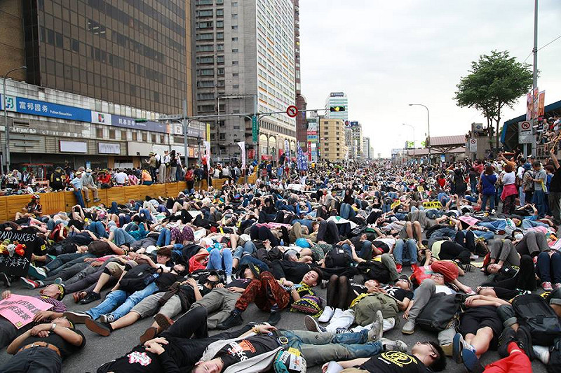 今(27)天下午登場的反核遊行,上萬人從凱道出發,行經佔領忠孝西路時,主辦單位全國廢核平台為了模擬核災發生,交通癱瘓情形,一聲令下後民眾包圍佔領忠孝西路,人多到連鎮暴警察都不得不撤退;隨後,現場響起核安警報,上千人就地躺下,場面相當壯觀。