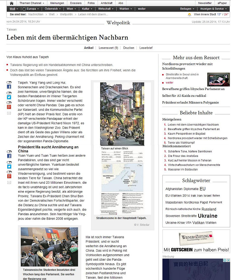 奧地利《維也納日報》24日對台灣針對服貿的抗議運動做了大篇幅的報導:〈與強權為鄰〉,太陽花運動國際部29日在臉書專頁上公布譯文,文中主要分成以下幾部分:親中的馬總統、對中國強大經濟力之恐懼、抗爭讓政府轉向、失去兩岸和平就會失去一切、我們不知道沉默多數們的想法,以及台灣地位未定論。