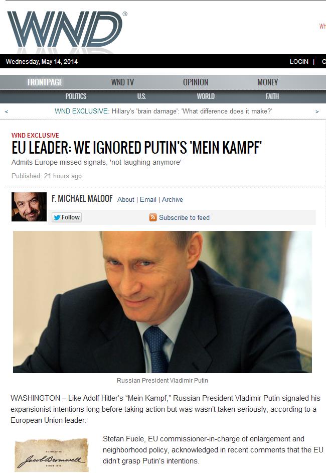 俄羅斯總統普亭(Vladimir Putin)肢解鄰國烏克蘭並逐步掌控前蘇聯版圖的手段引起世人側目。自己的祖國捷克曾遭希特勒(Adolf Hitler)侵犯的歐盟執委福勒(Štefan Füle)指出,普亭的擴張政策野心早在2005年就已經顯露,只是世人忽視了普亭版的《我的奮鬥》(Mein Kampf)。