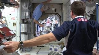3位太空人在無重力條件下,展現一些特技式的足球技巧。