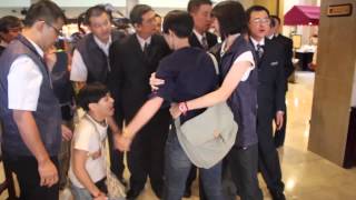 影片即為勞團成員在江宜樺從側門走進飯店後,撒冥紙遭保全阻擋以及被保全抬出飯店外的情形。