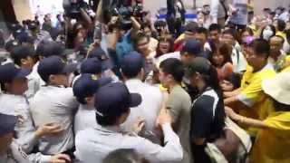 即便10分鐘後場面稍微平靜,警方和人群分為兩邊,但卻突然有多名警察走出來,當著所有人的面,直接把一名自救會6、70歲的老翁拖走,再度引發衝突。不只自救會成員,之後又有10多人,連來聲援的市議員參選人王奕凱都被以這樣的方式拉走,而其他數10人則在警方引導下,排隊從側門走出勞動部。最後,上百人全部都上了警備車。