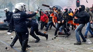 影片即為比利時3大工會6日號召逾10萬民眾上街抗議政府,警民爆發大規模衝突實況。