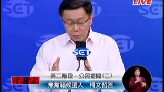請問柯文哲先生,你對於大家都遵守的法治,你本人就可以不遵守嗎?MG149是台大醫院院長所認定的違法賬戶,唯一的個案。但是你說私設賬戶,接受廠商捐款是打破台大醫院史上循環剝削的陋習,並且說柯文哲的存在就是台大醫院的價值。以你這種,獨特的,超越法律的價值觀,請問你如何得創造你剛剛提到的台北市的願景?如果你當選臺北市長,發現市政府或市立醫院有人像你一樣私設捐款賬戶,你會如何處理?」