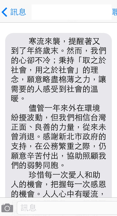 新北市府社會局今天表示,某中小企業無名氏於2011年捐贈1千萬元,給新北市政府提供幫助弱勢家庭,接著從2012年起連續4年,每年捐贈2千萬元,累積一共9千萬元。市府這4年間則運用善款辦理19項服務方案,幫助23萬多名弱勢家庭成員。