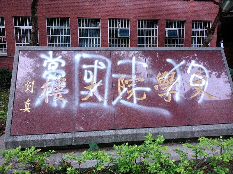 「師大青年」臉書今(8)日分享2張照片並表示,師大文學院前劉真題字被塗上「黨國走狗」字樣,四六剛過,當年劉真大力整頓師大學風,兩者是否有直接關聯,有待校方調查。