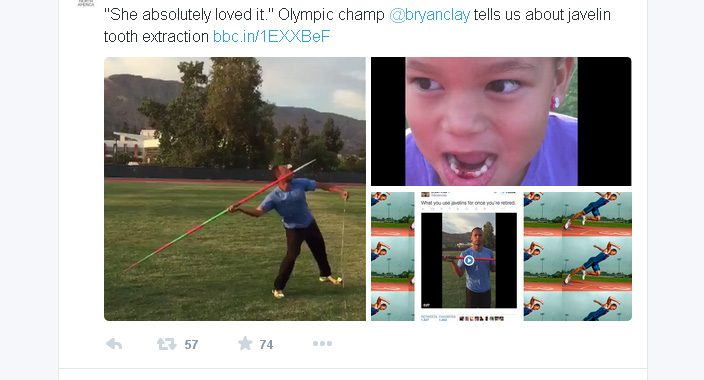 奧運標槍竟然被用來拔呀?!曾獲2008手北京奧運男子十項全能金牌的美國選手布萊恩葛雷(Bryan Clay),就用他聞名世界的標槍為女兒拔牙,甚至還把拔牙過程po上自己的推特。