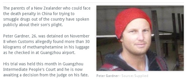 紐西蘭電視台(NZTV)於1日上午報導,今年26歲的彼得‧加德納(Peter Gardner)在去年11月8日遭中國海關扣留,據稱是他在廣州機場準備出關的時候,在行李中被發現了超過30公斤的甲基安非他命(methamphetamine ,俗稱「冰毒」)。