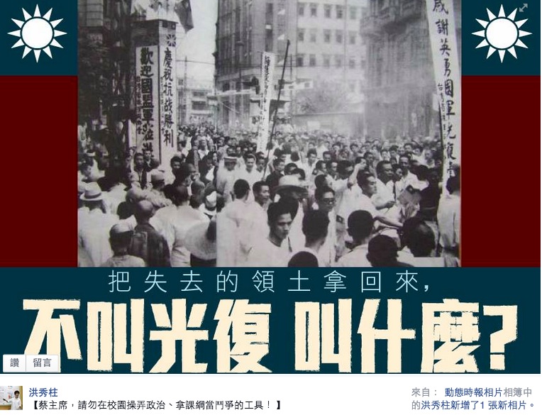 對此,國民黨準總統參選人洪秀柱13日在臉書表示,這次課綱是非常小的微調,幾乎沒什麼變化。身為國家的教育主管機關,應該勇敢捍衛正確的主張。歷史可以有不同的觀點,但教科書的史觀應該合憲,堅持國家尊嚴,符合多數人民的認知與情感。