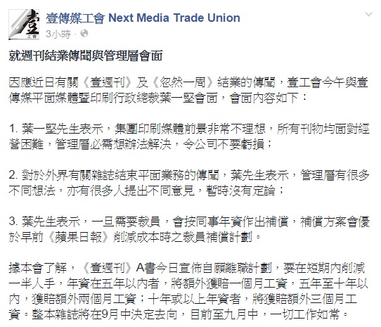 聲明表示,工會方面了解,《壹週刊》「A書」16日向員工宣布自願離職計畫,短期內削減一半人手,年資在5年以內者,將額外獲賠1個月工資,5年至10年以內者,獲賠額外2個月工資,10年或以上年資者,將獲賠額外3個月工資。整本雜誌將於9月中「決定去向」,目前一切工作如常。