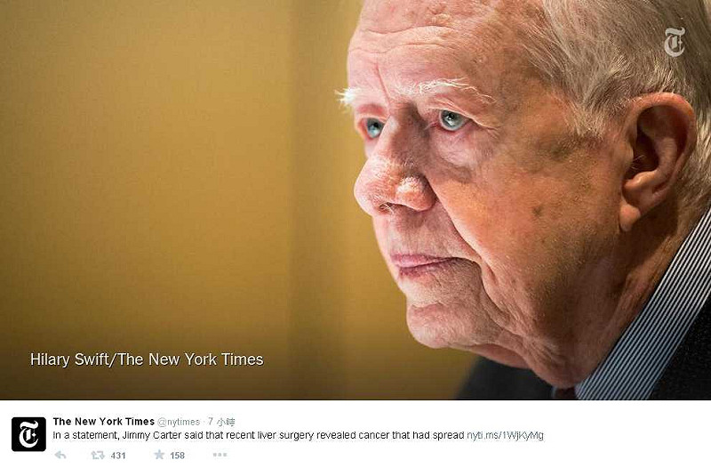 獲悉卡特罹癌後,白宮也隨即發表聲明表示,「美國總統歐巴馬和第一夫人蜜雪兒,祝卡特總統早日康複。」歐巴馬說,「卡特與家人正面臨挑戰,我們將堅定地與他們一起禱告;正如同卡特家族不時展現的決心與魅力。」