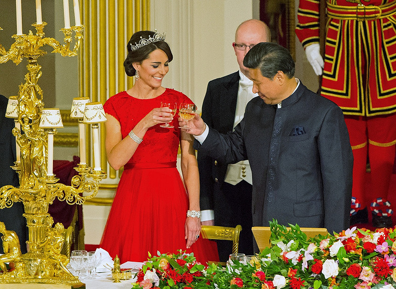在座位的安排上,習近平兩旁分別坐著女王與凱特王妃,凱特以一身紅色禮服現身,佩戴女皇借出的蓮花型鑽石王冠,再飾以垂墜式鑽石耳環,光彩動人。這也是凱特王妃嫁入英國王室以來,第一次參加英國國宴,備受英國媒體關注。媒體形容凱特王妃禮服的選擇,是特別挑選在中國象徵喜氣、跟中國五星旗同樣的紅色。
