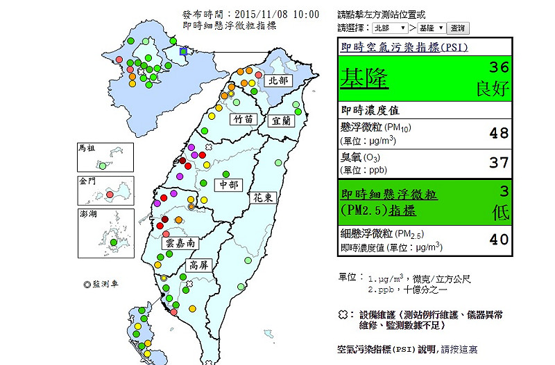 根據環保署空氣品質監測網顯示,北部、竹苗及中部地區7日受到大氣擴散不佳的影響,細懸浮微粒濃度偏高,達到「紅色警戒」的中高等級。而8日北部及中部因為弱風氣候,大氣擴散條件不佳,導致境內污染物持續累積不易擴散,PM2.5系懸浮微粒濃度偏高,預計北部9日下午就會改善,中部民眾可能還要多忍受一天,外出最好戴上口罩,減少在戶外活動。
