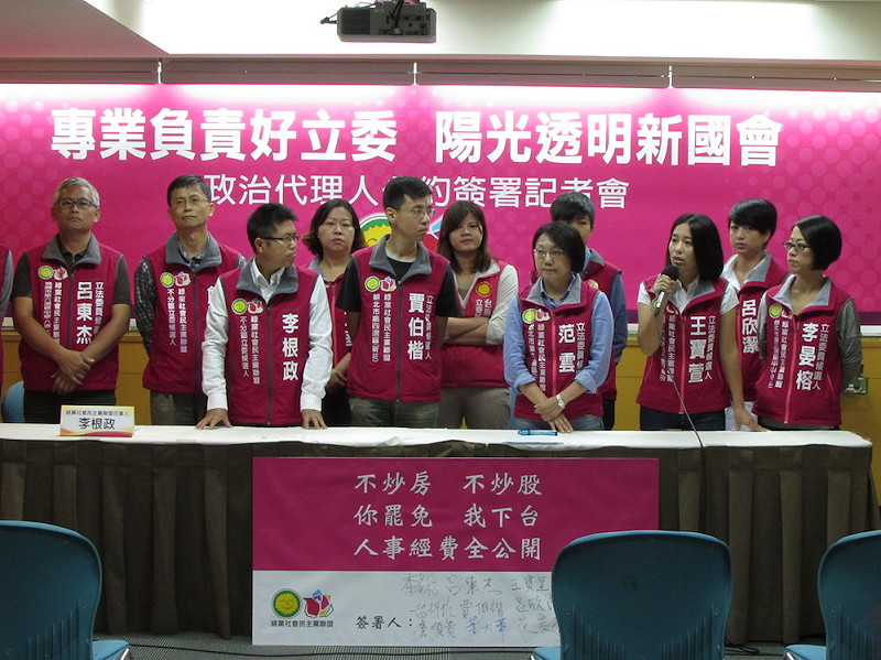 「不炒房,不炒股」、「你罷免,我下台」、「人事經費全公開」,綠黨社會民主黨聯盟15位區域及不分區立委參選人在17日簽署政治代理人公約,承諾當選後將會遵守前述3大行為準則。