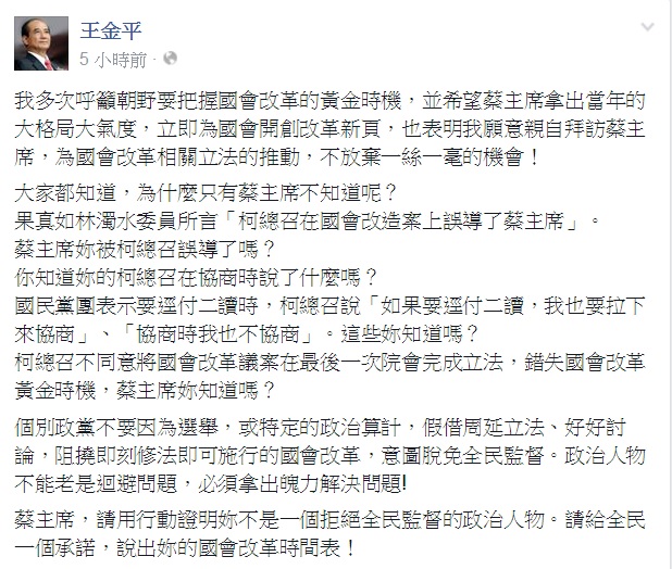 王金平表示,他曾多次呼籲朝野要把握國會改革的黃金時機,並希望蔡英文拿出當年的大格局大氣度,立即為國會開創改革新頁,也表明願意親自拜訪蔡英文,推動國會改革相關立法。