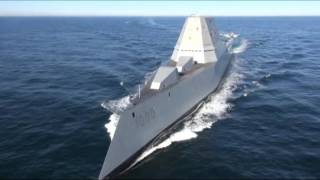 CBS報導,200多名參與建造船艦的緬因州巴斯鋼鐵廠(Bath Iron Works)的工作人員與海軍,一起見證這艘超級軍艦的試海航行。這次試航主要著重於該艦的推進力、移動及安全性能,只見造型前衛的船艦乘風破浪前行,它外型特殊的尖角將使敵人的雷達波偏轉,讓它在敵人的雷達上只會顯現成1艘小漁船,幾乎隱形。艦上的電腦導引的飛彈系統,可射擊100公里以外的目標,而創新的整合電力系統驅動,未來可供給雷射武器和磁軌砲等武器發射,自動化設施所需的人力約傳統的一半。