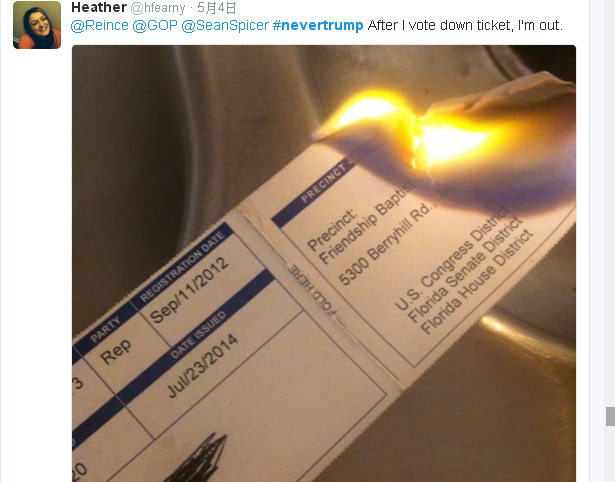 川普奪得印第安納州之後,許多保守派的部落客和意見領袖,在社群媒體上貼出自己燒毀共和黨選民登記證的照片,有些人甚至貼上希拉蕊陣營的「我挺她」(#I'mWithHer)字樣,表態寧願民主黨勝選,也不要川普。