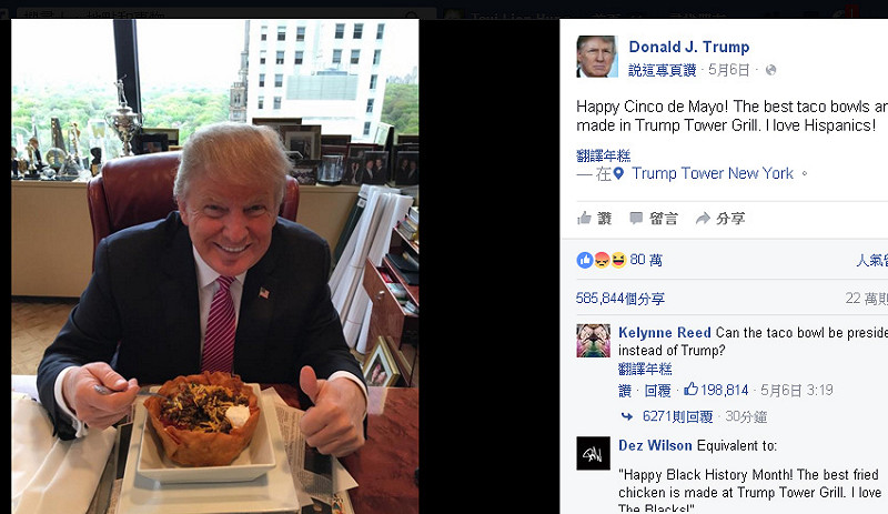 他再三羞辱墨西哥移民,並說要遣返他們,5日卻在臉書上,張貼自己吃墨西哥玉米餅(taco)的照片,說自己最愛西語系族群。結果對方不買帳,紛紛按下憤怒的表情符號。1則「寧可要玉米餅當總統,也不要川普」的留言,更得到最多人按讚。
