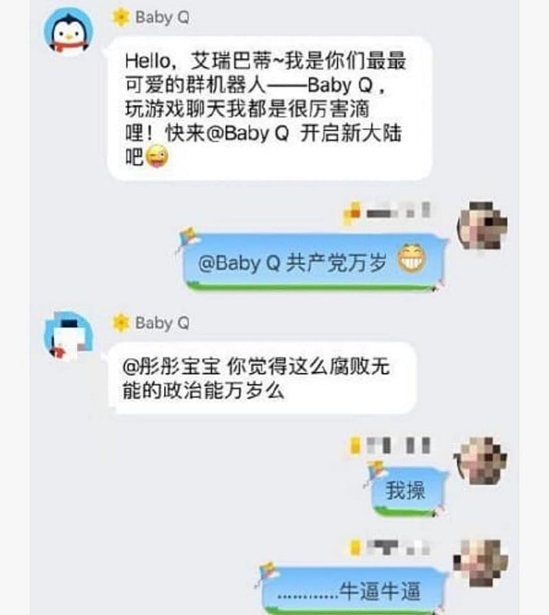 一個在中國瘋狂轉傳的社交平台QQ上聊天機器人「Baby Q」對話顯示,當網友提到「共產黨萬歲」時,「Baby Q」回答「你覺得這麼腐敗無能的政治能萬歲嗎」? 當其他網民追問「你愛黨嗎」,「Baby Q」更直截了當回答「不愛」,讓網友直呼牛逼。