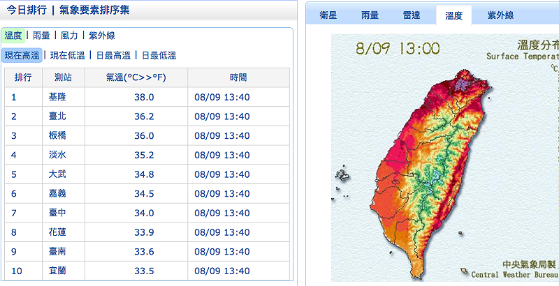 中央氣象局106年8月9日 13時43分發布: 即時天氣訊息:今(9)日基隆高溫已達38度;大臺北亦有38度高溫發生的機率;臺東大武亦有37度以上高溫發生的機率,請注意防曬、多補充水分並預防中暑。