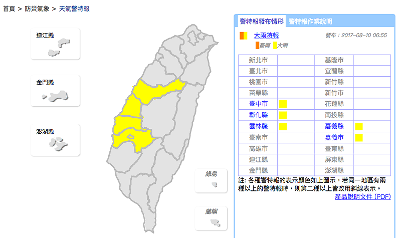 大雨特報警戒地區:台中市、彰化縣、雲林縣、嘉義縣、嘉義市。