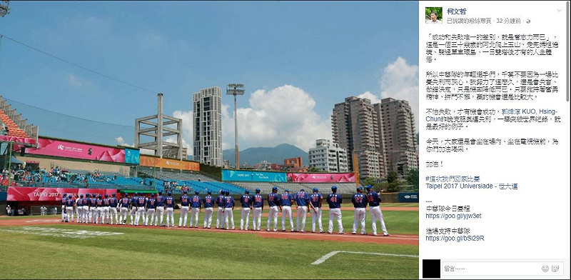 台北市長柯文哲昨(21)日在臉書遭網友質疑世大運開幕維安有漏洞,「誰是王八蛋?」柯P親自回了一句「你和那些反年改團體」,引發熱議,但該留言稍早已遭刪除。柯文哲今(22)日雖未有公開行程,但仍在臉書發文,力挺台灣隊,並稱自己「我努力了這麼久,還是會失言」。