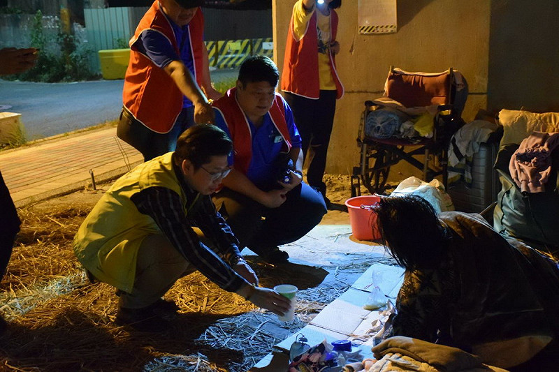 有關街友之關懷訪視服務,屏東縣政府於冬日寒夜持續協同社團法人屏東縣金鳳凰緊急救護協會於街友常棲宿地點訪視以勸導入住屏東縣遊民收容所。 圖:屏東縣政府/提供