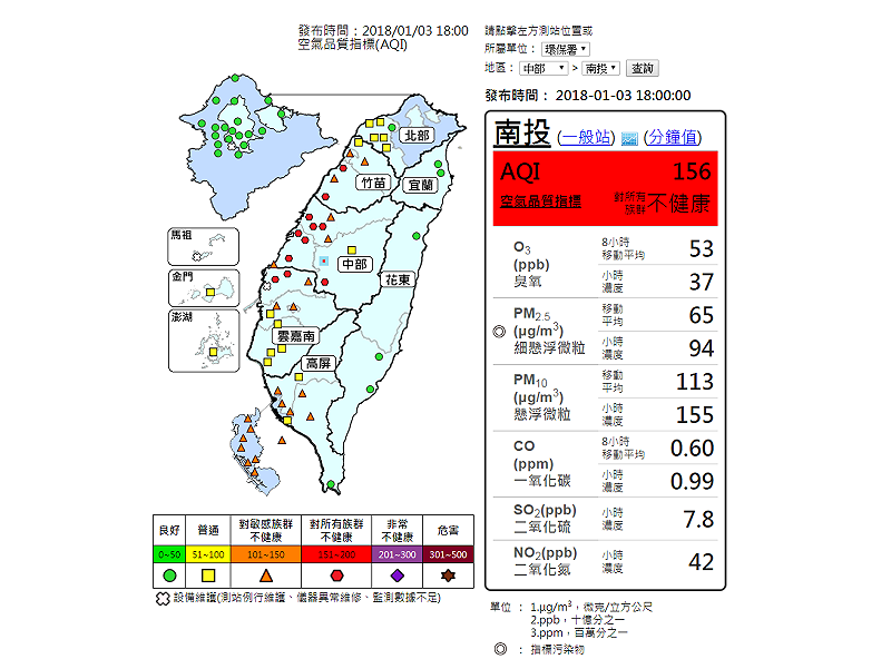 另外,新竹縣(竹東: 44)、新竹市(新竹: 44)、苗栗縣(苗栗: 53)、台中市(豐原: 53、大里: 46)、雲林縣(斗六: 41)、嘉義縣(新港: 36)、嘉義市(嘉義: 39)、高雄市(橋頭: 43、仁武: 50、鳳山: 41、大寮: 47、楠梓: 45、左營: 38、前金: 50、前鎮: 44、小港: 47、復興: 50)、屏東縣(屏東: 45、潮州: 51)等測站,PM2.5在24小時平均值已達二級預警。