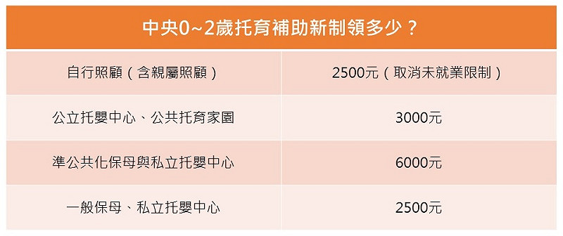 一、自行照顧:只要是所得稅率未達20%的家庭且未領取留職停薪育兒津貼或接受公共化或準公共化托育服務,就可申請每月2500元之育兒津貼,這部分取消舊制的未就業限制,父母都在上班也可以領了。也就是說,只要是未送托至公立托嬰中心、準公共化的簽約保母或托育機構,無論是自己帶或是爺爺奶奶帶,中央都會給每月2500元的育兒津貼。