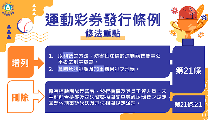 教育部體育署表示,考量運動彩券也屬於運動產業之一環,為使罰則構成要件及刑度與「運動產業發展條例」一致,擬具「運動彩券發行」條例修正草案,修法重點包括:第一,增列以利誘之方法妨害投注標的運動競技賽事公平者、意圖營利犯罪及加重結果犯之刑罰;第二,刪除擁有運動團隊經營權者、發行機構及其員工等人員,未主動配合檢察及司法警察機關調查等處以罰鍰之規定,回歸依「刑事訴訟法」及「刑法」相關規定辦理。