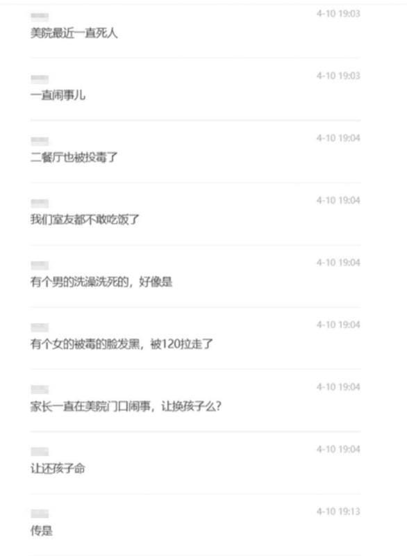 目擊者表示,擔架上的女子臉部皮膚明顯變色,甚至有圍觀學生驚呼「臉都黑了」。4 月 10 日,網路上出現一名自稱該校學生的爆料,稱學校內部「一直死人」,並指出家長們「一直在美院門口鬧事維權」。