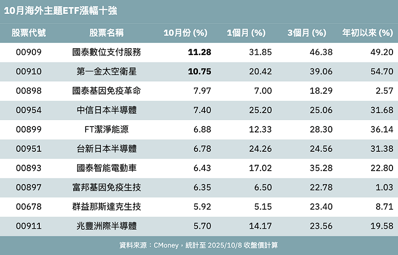 第三季全球股市強漲,原先市場預期,10 月可能湧現獲利賣壓,但全球行情不走回頭路。其中海外主題ETF更成 10 月份強攻要角,Cmoney 統計至週三(8日),2檔海外主題ETF 10 月份漲幅逾 10%,包含國泰數位支付(00909)、第一金太空衛星(00910),今日兩檔ETF盤中分別強攻逾 3%、2.6%,再創掛牌以來新高。