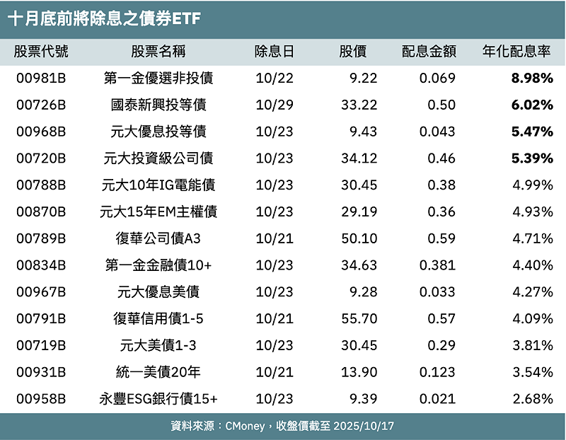 來到十月底,還有 13檔債券ETF即將實施除息。其中,共有 4檔預估年化配息率超過 5%,依序為第一金優選非投債(00981B)達 8.98%、國泰新興投等債(00726B)6.02%、元大優息投等債(00968B)5.47%,及元大投資級公司債(00720B)5.39%。欲參與除息的投資人,可把握這幾天最後買進時機。