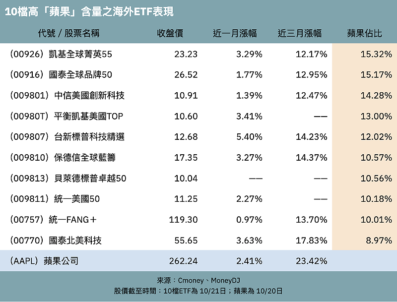 彙整 Cmoney、MoenyDJ 等數據顯示,目前在台股市場掛牌的 ETF 中,超過 20檔持有蘋果股票,在此列舉出含量前十名。其中,前兩名的持股佔比甚至超過 15%,分別為凱基全球菁英55(00926)的 15.32%、國泰全球品牌50(00916)的 15.17%,該兩檔 ETF 皆以投資全球龍頭企業為主題,但選股邏輯略有不同。