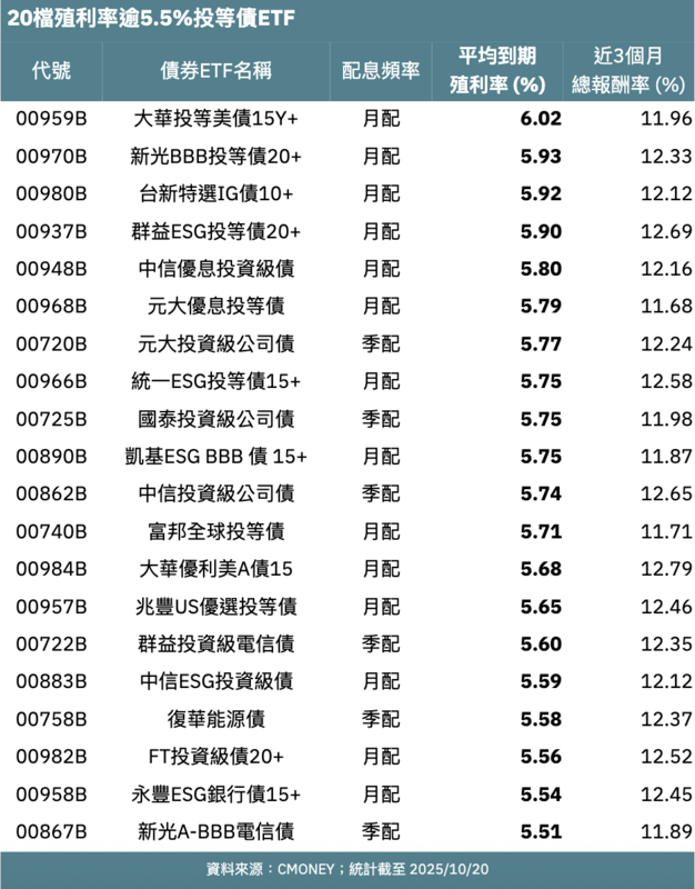 再觀察 56檔投等債ETF最新殖利率表現,統計至10月20日,共有 20檔在 5.5%以上,在 6%以上僅一檔「大華投等美債15Y+」,其嚴選票面利率最高前 10%、剩餘存續期間 15年以上的投資等級債,不僅降息初期有利投資人鎖利,隨降息循環展開更有潛在資本利得可期;若就報酬率表現觀察,在 20檔殖利率 5.5%以上投資等級債ETF中,以 00984B的報酬率最為亮眼,以 12.79%居冠。