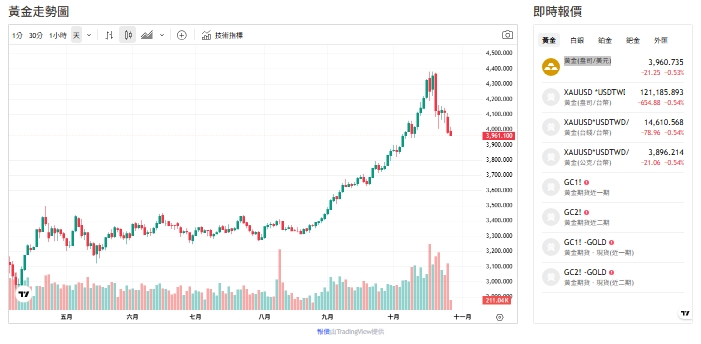 美國貿易代表稱中美貿易談判取得重大進展,財政部長貝森特預期中國將恢復大豆大量採購,並延後稀土出口管制一年。避險資金回流風險資產,金價震盪走弱至每盎司4,050美元,今(28)日報3963美元。截至今天(28日)黃金交易價來到3963(盎司/美元)。