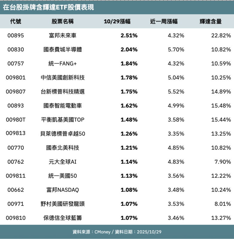 在輝達大漲激勵下,31檔在台股掛牌的含輝達ETF中,至周三(29日)共有 14檔單日漲逾 1%,包含 7檔主題型、7檔市值型,其中,富邦未來車(00895)、國泰費城半導體(00830)兩檔單日均上漲 2%以上;近一周漲幅則在 3.35%~5.7%之間。