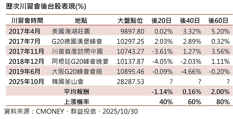 回顧過去五次川習會後台股表現,加權指數於後 20個交易日多數呈現下跌,平均跌幅為 1.14%;後 40個交易日也有兩次下跌,平均報酬率約 0.16%;至於後 60個交易日,則多數呈現上漲,漲幅約 2個百分點。