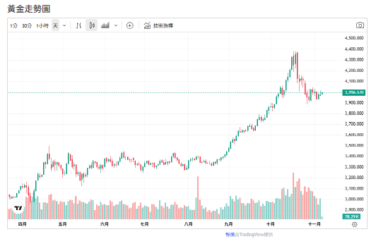 台銀表示,因歐元、日幣等非美貨幣連跌數日後,短線全面反彈,美元指數衝高至 100.3 後反轉承壓,回落至 99.9 附近,支撐金價延續日間漲勢突破 4,000 美元關口並走高至 4,019 美元,後於 4,008-4,015 美元間波動。稍晚英國央行維持政策利率 4%不變,但暗示12 月有機會下調利率,英鎊短線拉升後回落,美元指數跌至 99.75 下方止穩反彈,加上美股普遍下跌,部分資金獲利了結,賣壓湧現迫使金價再度壓回至 4,000 美元下方整理。