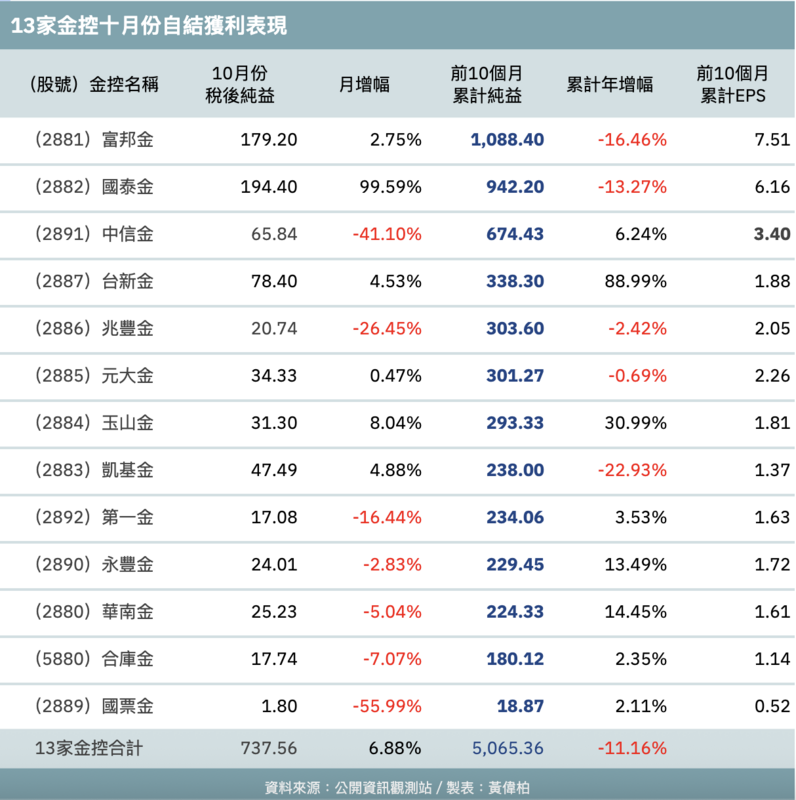 ◎ 前十月獲利排行:富邦金 1,088.4 億元、國泰金 942.2 億元、中信金 673.43 億元;台新新光金、兆豐金、元大金突破 300億元;玉山金、凱基金、第一金、永豐金、華南金則站上 200億元。